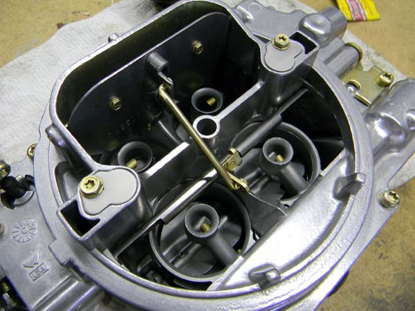 One step richer calls for .116" mains, .110" secondaries, and .073" x .047" metering rods. I installed the stiffest, plain/silver (8" hg) step-up spring. This would provide fuel enrichment under load sooner than the stock spring.