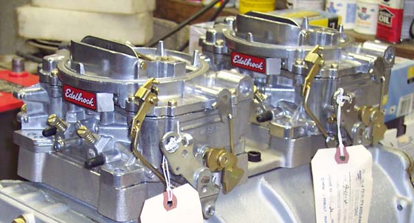 I think the Carter's have a slightly more retro look on top of a blower in an inline configuration too. So, with all this in mind I chose a pair of 750's (Edelbrock #1407) and purchased them, rebuilt, through National Carburetor (via Ebay where I saved even more over buying from their website). Edelbrock actually recommends a pair of 600 cfm carbs on a blown 440.
