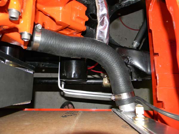 A 16lb. coolant recovery cap is a carryover from the old radiator. The coolant overflow hose is plumbed to a recovery tank I have hidden inside the fender.