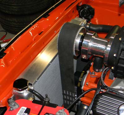 I determined that the newer aluminum radiators available might give me thinner dimensions without sacrificing cooling ability. Still, with a power steering pulley at the crank, I'd be lucky to have 1/4" clearance between the blower drive pulley's and the radiator core. Forget about any kind of fan in there.
