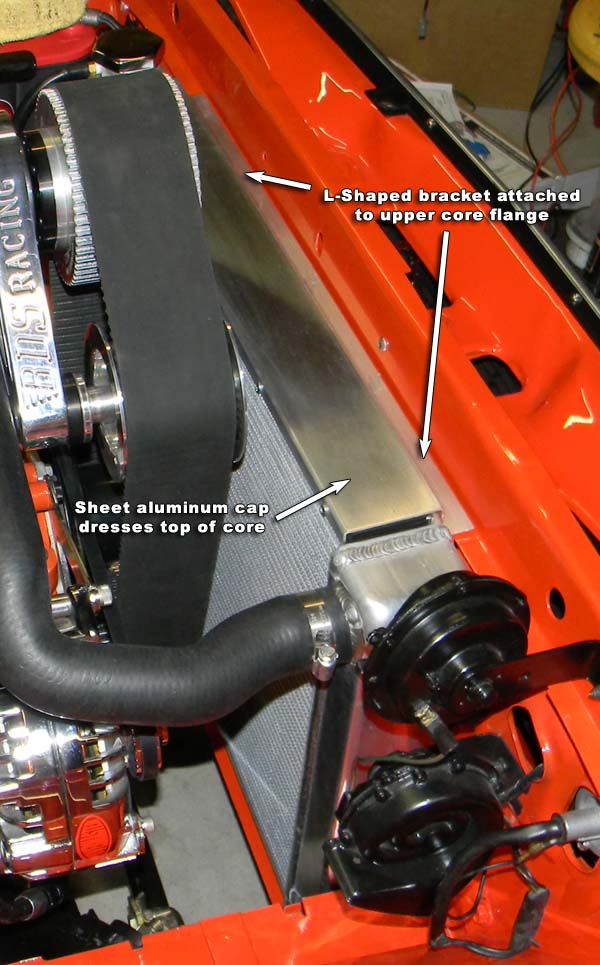 The upper gap was covered by an aluminum L-shaped bracket attached to the core flange, along with foam weatherstrip to prevent chaffing. The whole thing was capped with a separate aluminum piece to dress it up.